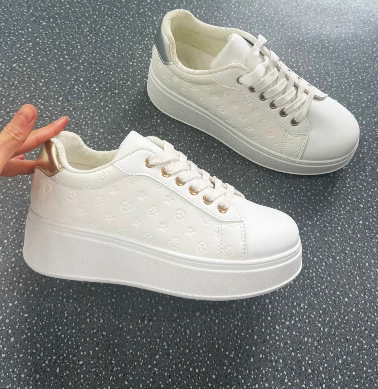 Gold trim chunky white designer inspired print trainers